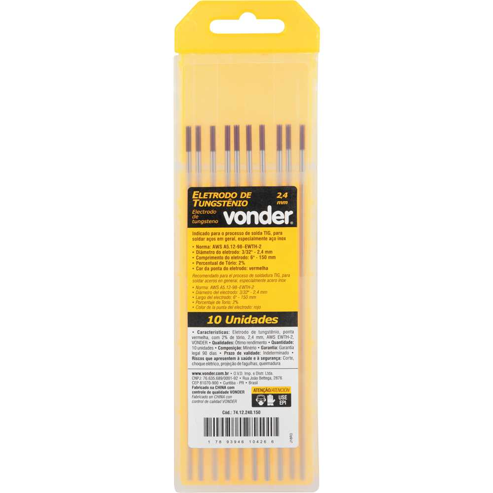 Eletrodo de Tungstênio 2,4mm Ponta Vermelha 2% Tório para Solda TIG em Aço Inox e Aços em Geral