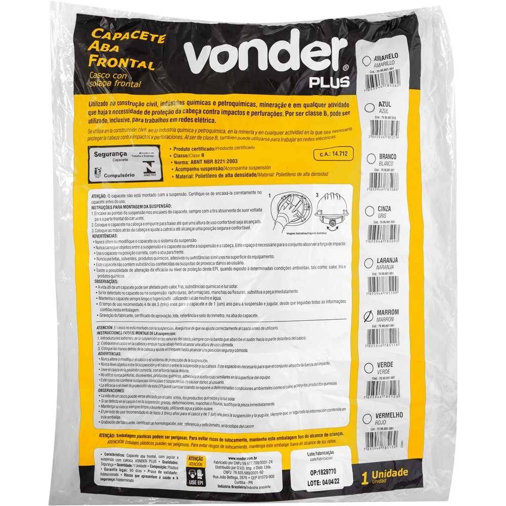 Fabricado pela renomada linha VONDER PLUS, este capacete é construído com materiais de alta resistência que garantem uma vida útil prolongada. O foco na qualidade não está apenas na durabilidade, mas também na conformidade. O produto atende a rigorosos padrões de segurança, oferecendo um equipamento confiável que protege contra impactos e penetrações, sendo um investimento inteligente na segurança individual do trabalhador.